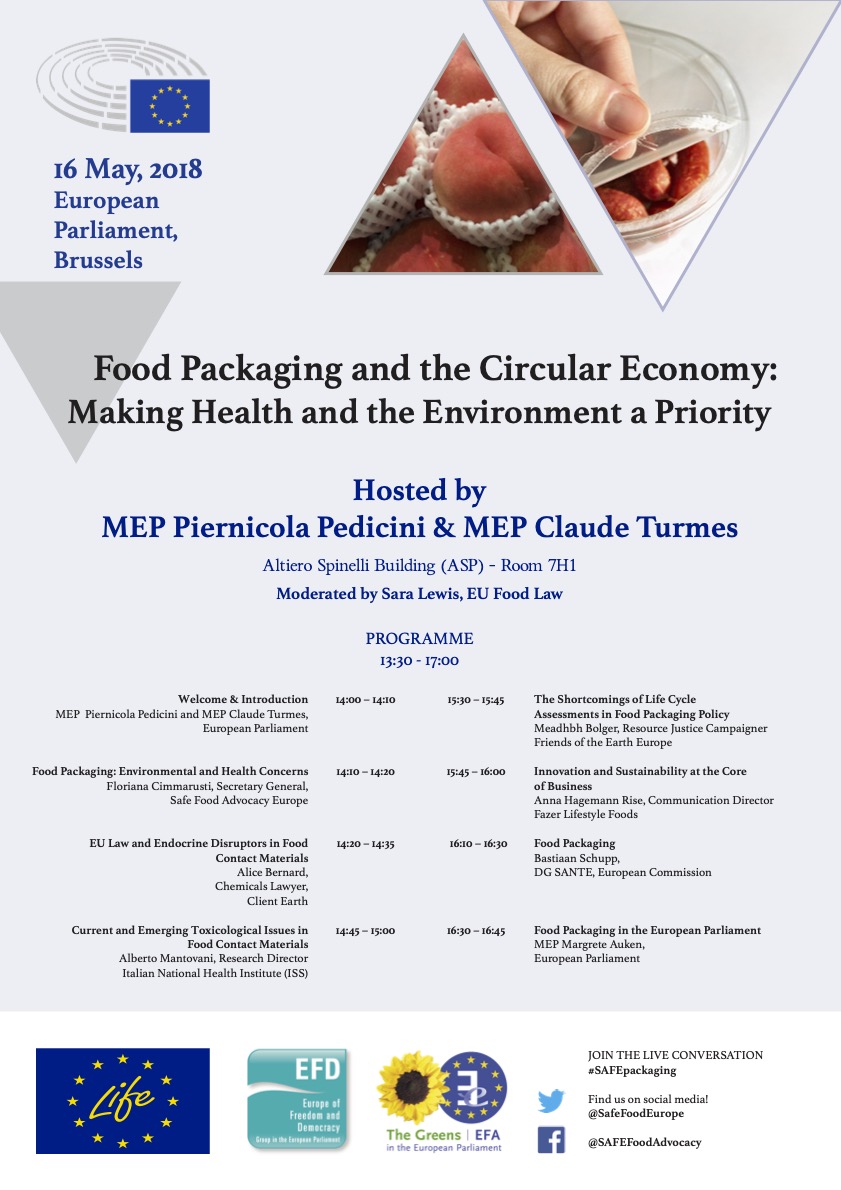 On May 16th, 2018, SAFE helped organise a European Parliament roundtable on food packaging in the framework of the LIFE programme 2018-2019. The event, entitled “Food Packaging and the Circular Economy: making health and environment a priority”, was hosted by MEPs Pedicini and Turmes.