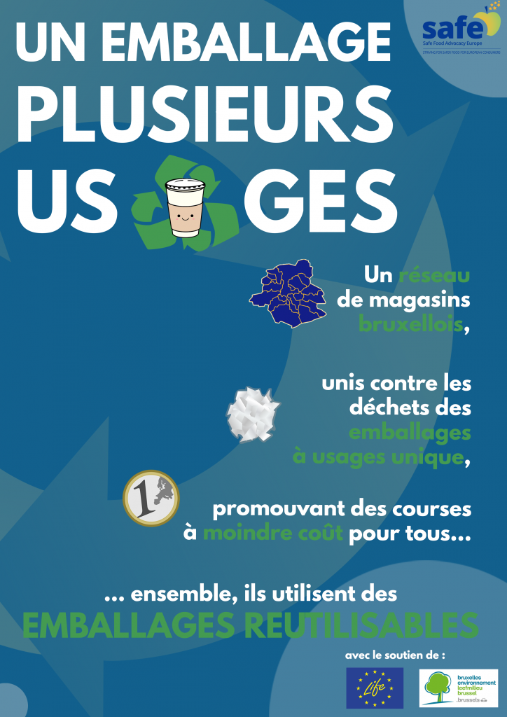 SAFE has designed a pilot project regarding food-packaging waste in urban areas targeting European cities. With the goal of increasing citizens’ awareness and promoting the use of reusable food packaging, we have launched the campaign ‘Un emballage, Plusieurs Usages‘ (FR) / ‘Curb Pastic, Curb Waste‘ (EN) / ‘Bedwing Plastic, Bedwing Afval‘ (NL) in Brussels. SAFE has gathered consumers and shopkeepers together in a dynamic network where signle-use packaging is reduced.